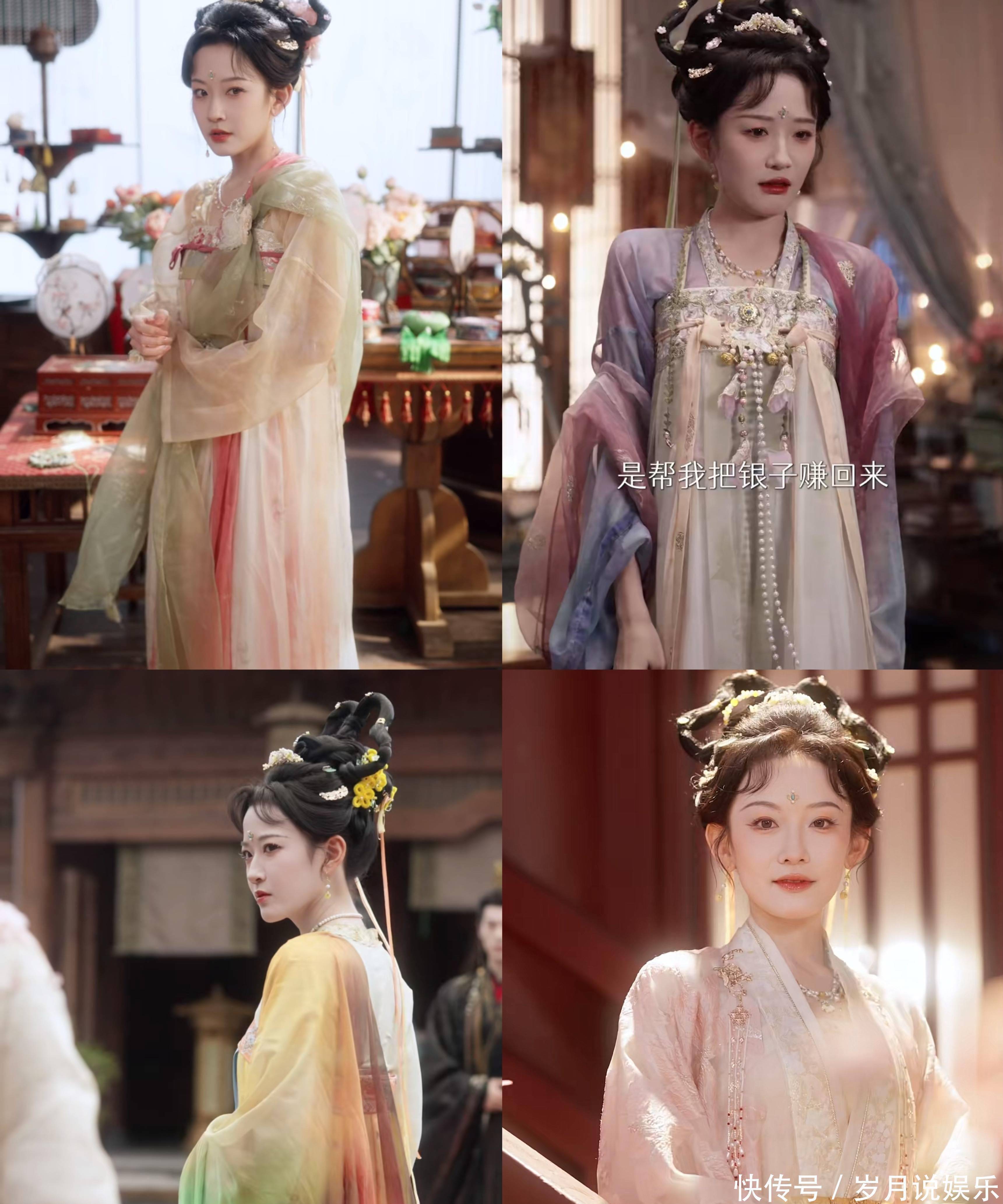 就连发髻上的饰品,也能看出是精心搭配过的,与服装颜色都是呼应的。